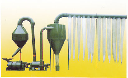 物料由進料口均勻投入粉碎室后,主軸高速旋轉,經固定在主軸上的刀片和機殼內襯板間的沖擊和高氣流剪切將物料粉碎,粉碎后的物料經塞檔室分級進入風機室,由風輪的吹送以及風機的引力使物料進入分離器,經分離器再次分級處理,粗料從回料咀返回粉碎室進行再次粉碎,成品料由引風機引出進入集粉器裝袋包裝,